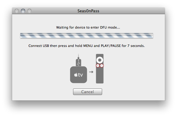 STEP 3: When prompted, connect the Apple TV to your computer via MicroUSB cable. Wait for the rapid flashing light then connect the power. Once both are connected hold both the ‘MENU’ and ‘PLAY/PAUSE’ buttons for 7 seven seconds to enter into DFU mode.