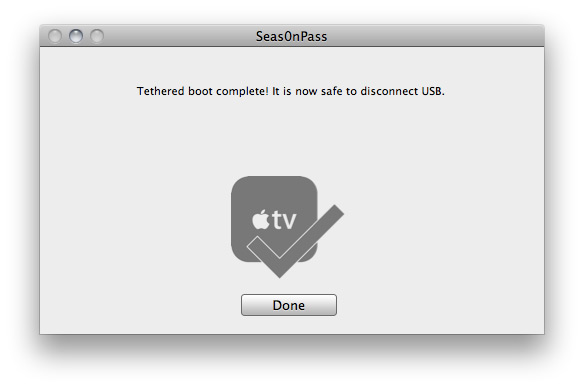 Congrats you have succesfully jailbroken your Apple TV 2G running on iOS 4.3.1 (4.2.1) by using Seasonpass.