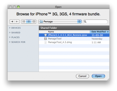 This will make iTunes prompt you to select the location for your custom firmware 4.3.1 file. Select the required custom .ipsw file that you created above, and click on “Open”.