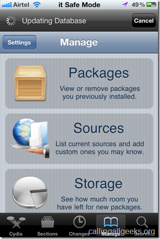 2. Once you are in the Cydia store tap the manage button, located along the bottom toolbar.