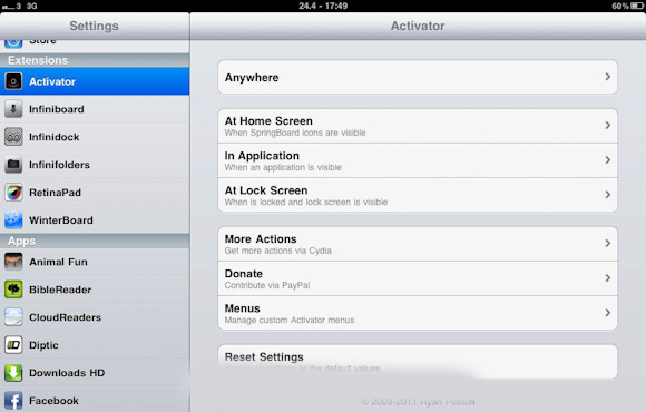 Activator, the Cydia Tweak you all have been waiting for. This is an app which makes your iPad more easy and fun to use because it works as a key to unlock all the shortcut possibilities for iPad. You can have access to many of your iPad features just by simply tapping your springboard. You can also operate some basic aspects of your iPad with this mind-blowing Cydia tweak.