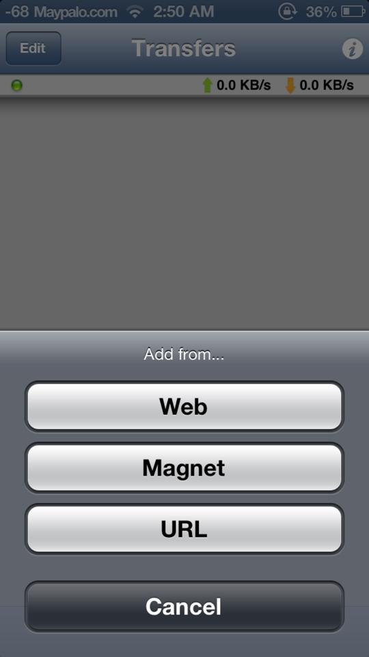 iTransmission allows you to download torrents via three options. One is ‘Web’ which allows you to search for a torrent via a Google search, the other is a ‘magnet’ which allows you to enter the magnet URL and the final one is a direct link to torrents via the ‘URL. To bring these three options up simply tap on the ‘+’ which is located in the bottom left corner.