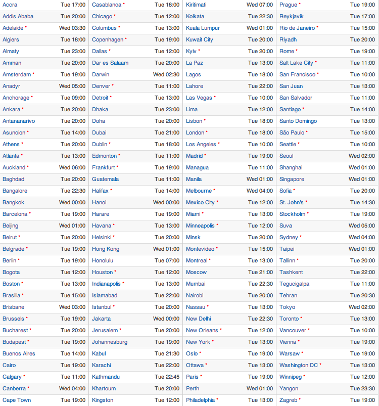 Well without waiting any time, check out the image below which shows time for almost every major city in the world. These timings are for today, October 22.