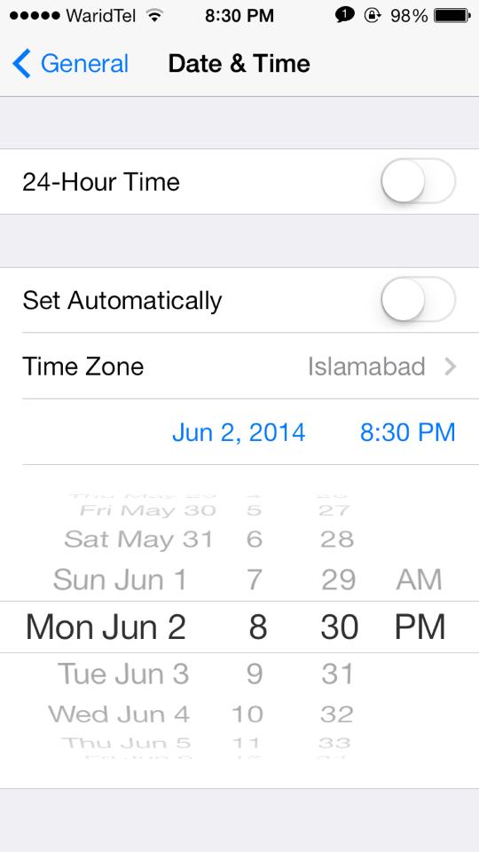 Step 8: You will be asked to change your time. Head over to Settings > General > Time & Date. Now turn off the automatic and set the time to June 2, 2014 and time to 8: 30 p.m.